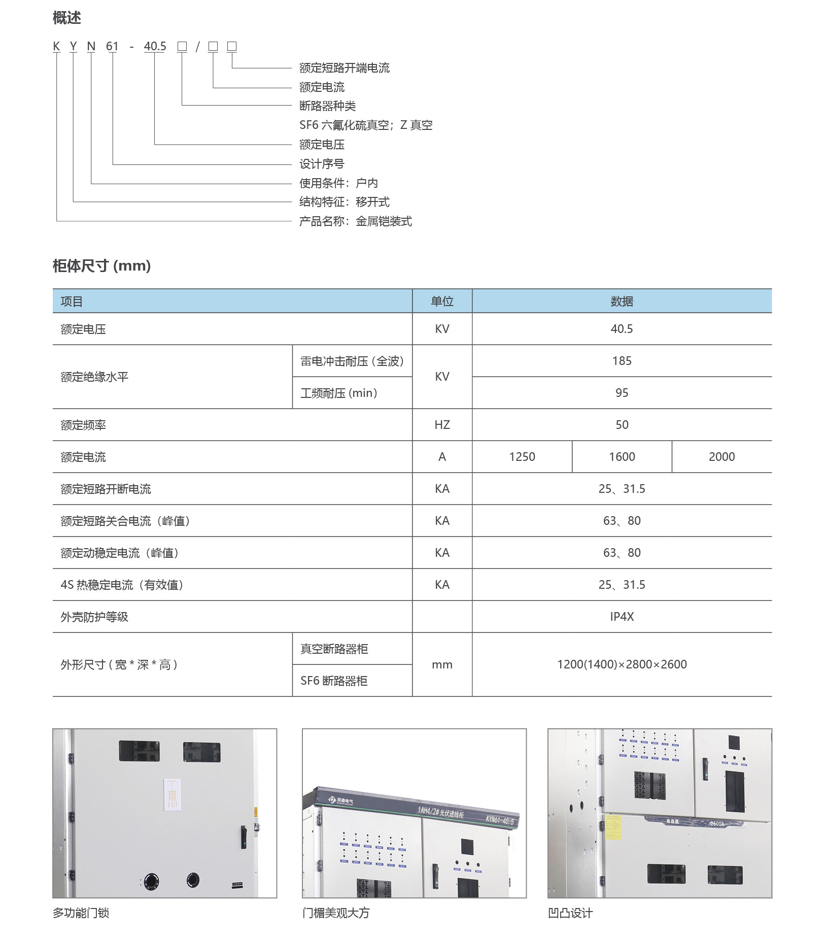 KYN61-40.5(Z)铠装移开式金属封闭开关设备(以下简称开关)系40.5KV三相交流50HZ成套配电装置,主要用于发电厂、变电站、工矿企业等的配电室接受和分配电能,对电路的控制保护及监测之用。还可使用于频繁操作的场所。符合标准:GB3906-1991,IEC298,DLT404-1997等。